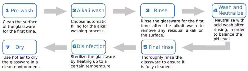 Load the laboratory utensils onto the container loading basket, load them into the inner cavity of the cleaning machine through the slide rail, remove the pollutants (including organic matter, inorganic compound, protein, etc.) on the containers through the cleaning steps, and clean the residues on the containers; Remove pollutants and cleaning agent residues on the utensils through rinsing steps, so that the ion residue on the utensils is lower than the detection limit. Remove cells, viruses, and bacterial residues on the utensils through disinfection steps, reducing the number of live microorganisms to the specified level; Remove residual water on the surface of the vessel through a drying step, allowing the residual water to vaporize and evaporate.