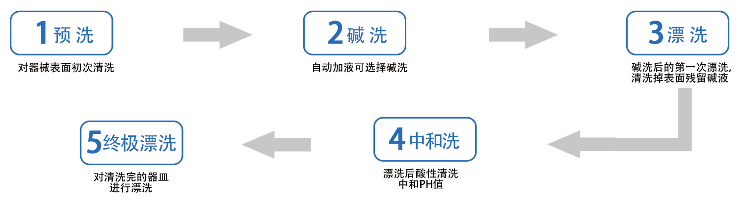 將實驗室器皿裝載到器皿裝載籃架上通過滑軌載入清洗機內腔中,通過清洗步驟去除器皿上的污染物(包括有機物、無機物、蛋白質等),使器皿上的殘留物被清洗掉;通過漂洗步驟去除器皿上污染物和清洗劑殘留,使器皿上離子殘留量低于檢測下限,通過去除器皿上細胞、病毒、細菌殘留,使活微生物數量減少到規定水平。