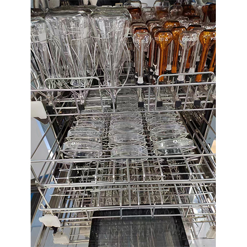 將實驗室器皿裝載到器皿裝載籃架上通過滑軌載入清洗機內腔中,通過清洗步驟去除器皿上的污染物(包括有機物、無機物、蛋白質等),使器皿上的殘留物被清洗掉;通過漂洗步驟去除器皿上污染物和清洗劑殘留,使器皿上離子殘留量低于檢測下限,通過去除器皿上細胞、病毒、細菌殘留,使活微生物數量減少到規定水平;通過干燥步驟去除器皿表面殘留水,使殘留水汽化后蒸發。