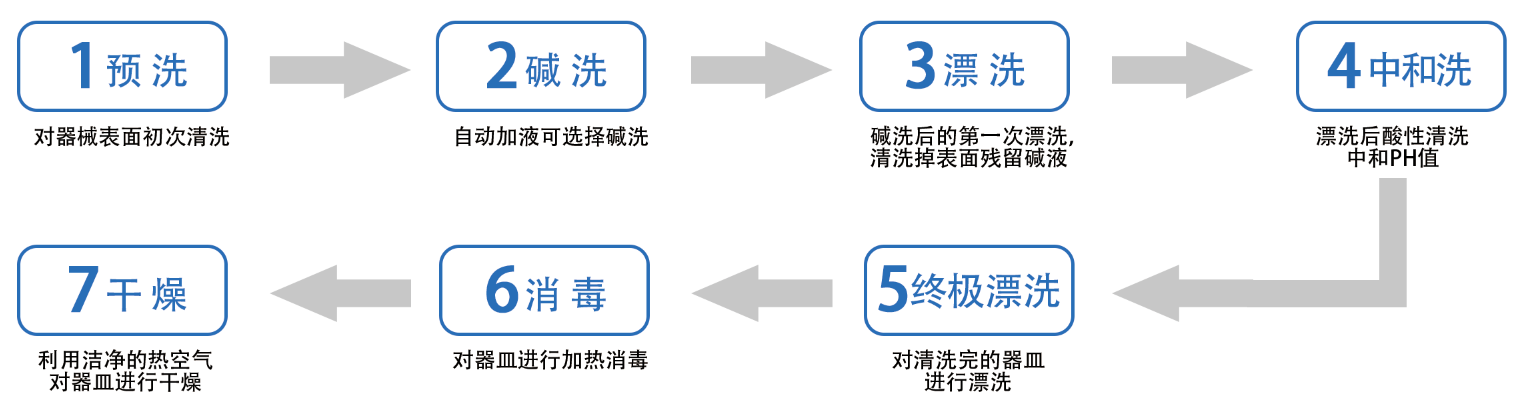 將實驗室器皿裝載到器皿裝載籃架上通過滑軌載入清洗機內腔中,通過清洗步驟去除器皿上的污染物(包括有機物、無機物、蛋白質等),使器皿上的殘留物被清洗掉;通過漂洗步驟去除器皿上污染物和清洗劑殘留,使器皿上離子殘留量低于檢測下限,通過去除器皿上細胞、病毒、細菌殘留,使活微生物數量減少到規定水平;通過干燥步驟去除器皿表面殘留水,使殘留水汽化后蒸發。